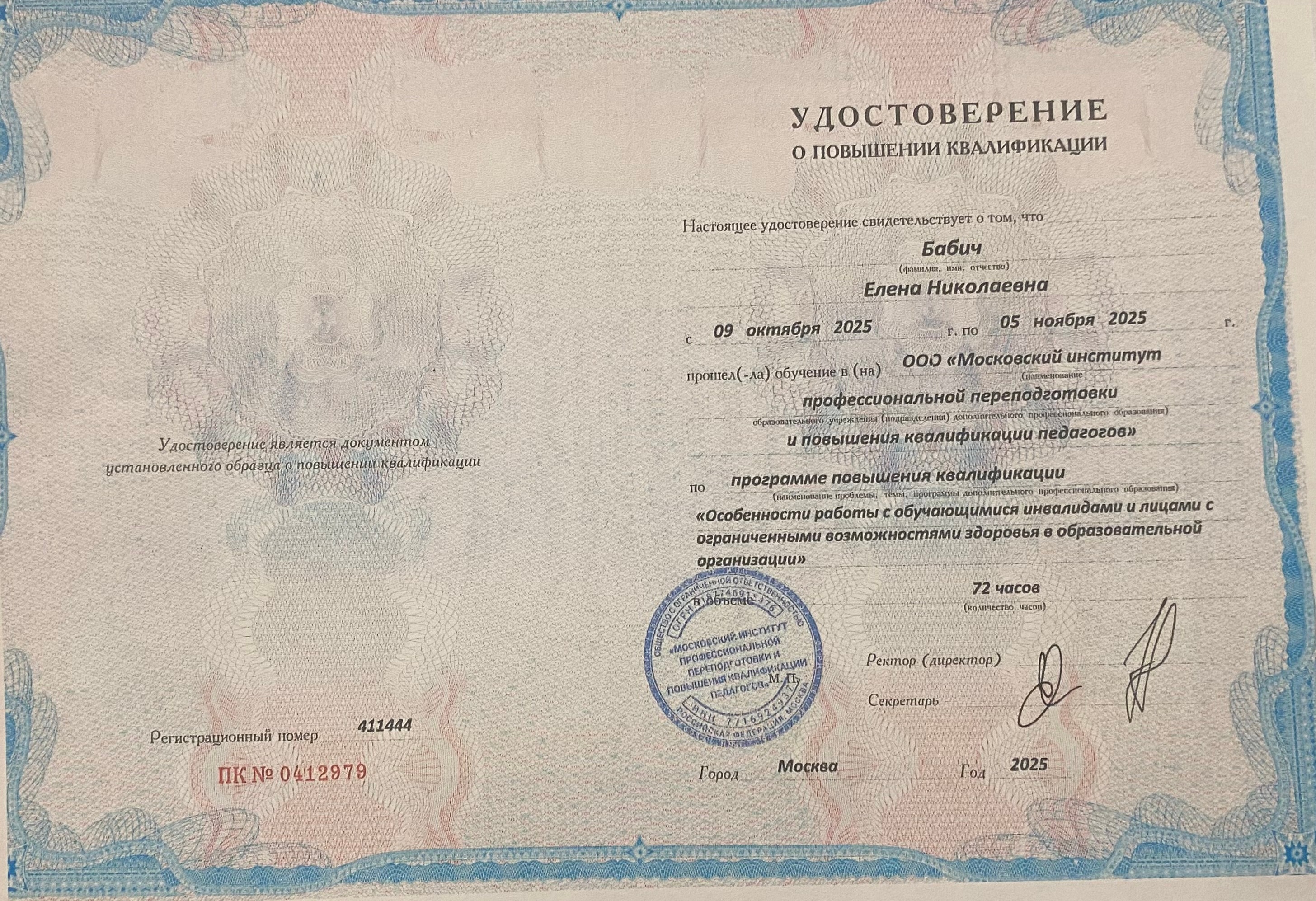 (ООО "Московский институт профессиональной переподготовки и повышения квалификации педагогов" . 72часов. Направленность: иное).